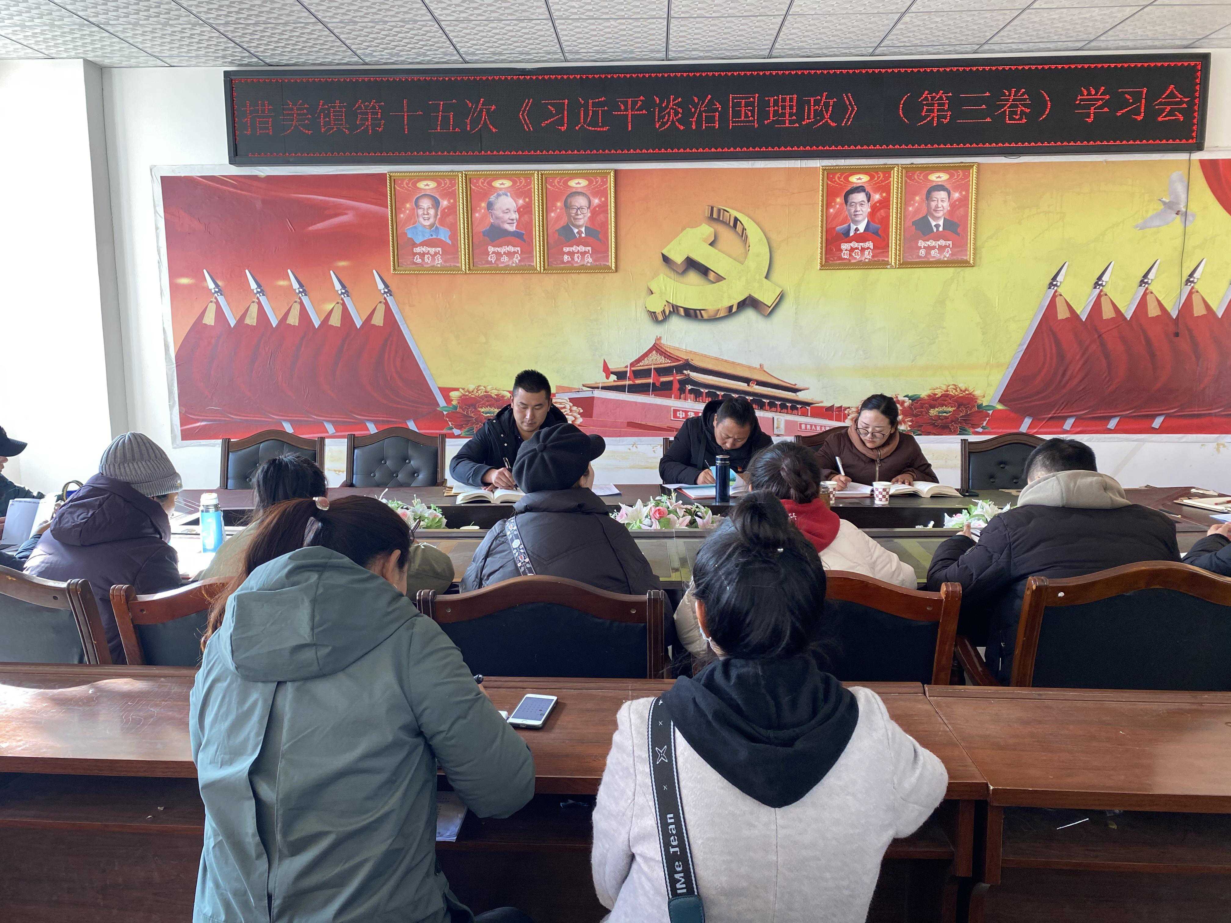 12月25日,措美镇全体在家干部职工在镇三楼会议室第十五次集中学习《习近平谈治国理政第三卷,会议由镇党委副书记、人大主席次仁单增同志主持。