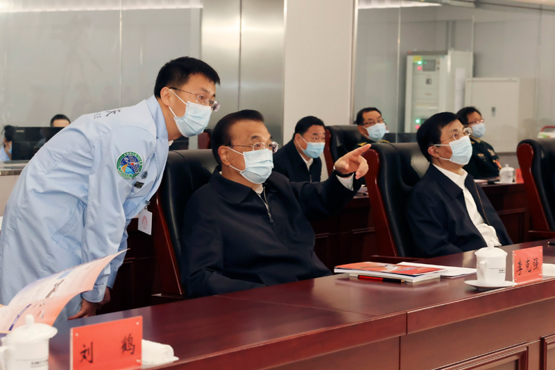 中共中央政治局常委、国务院总理李克强,中共中央政治局常委、中央书记处书记王沪宁在北京航天飞行控制中心观看发射实况。